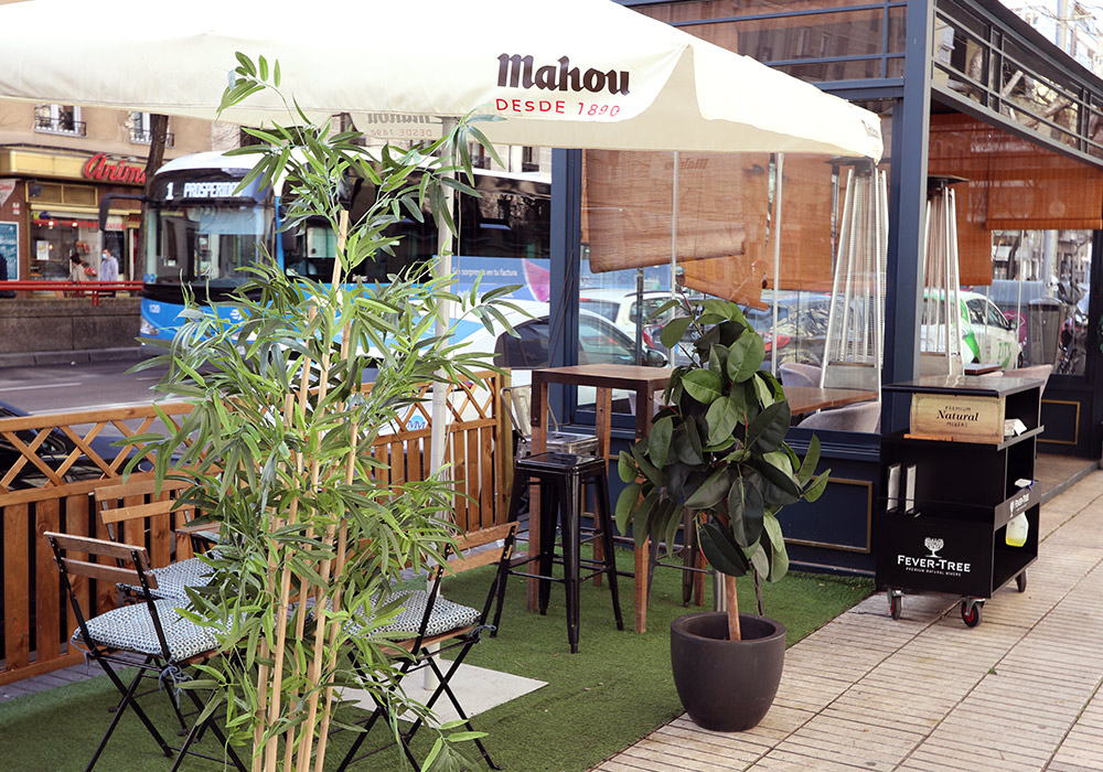 Zona de mesas altas y bajas donde disfrutar al aire libre en la calle Ortega y Gasset.
